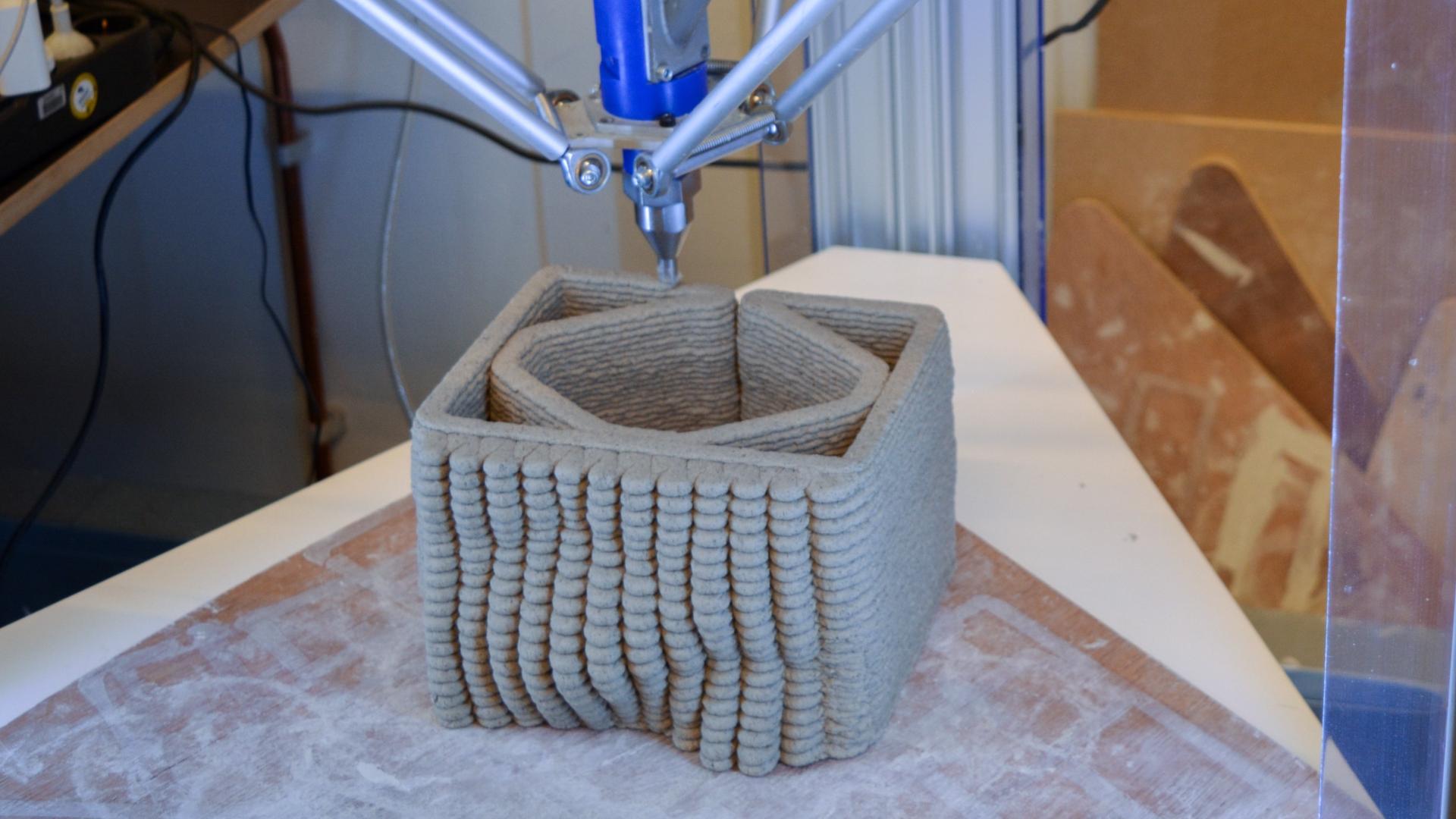 The project implements a material recipe by the studio Omlab. With this material, the project investigates how 3D printing can be leveraged to actively design and control material properties, to enhance the unique opportunities of the material.