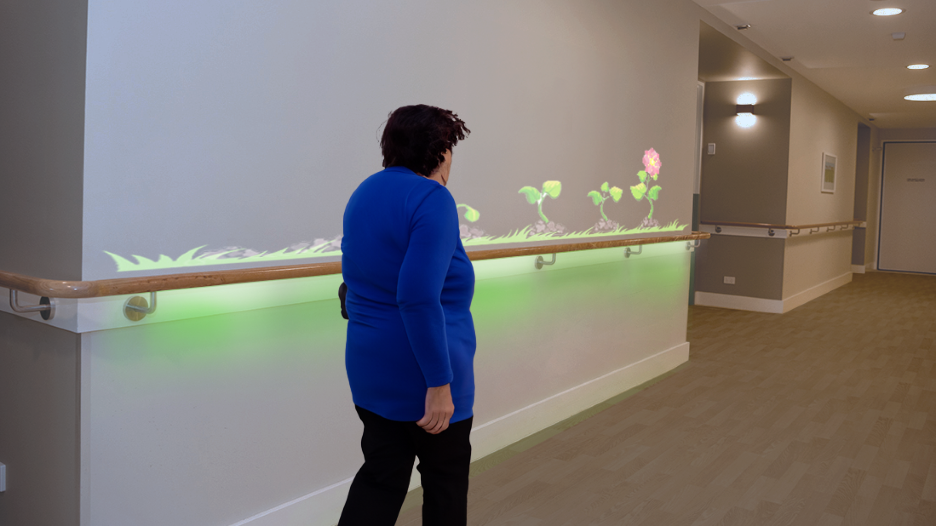 The biophilic handrail features an evolving wood texture that becomes increasingly pronounced as users approach the entrance to the garden. Beneath the rail, an ambient, pulsing green light provides subtle directional guidance. Additionally, a projector casts garden-themed vegetation onto the wall, with the projected visuals growing larger as users move closer to the garden entrance. This provides continuous sensory feedback through the handrail, while maintaining its primary safety function. The combination of tactile, visual, and interactive cues, reinforce the sense of wayfinding in the right direction. As a result, individuals may require less assistance from caregivers to navigate independently toward the garden.
