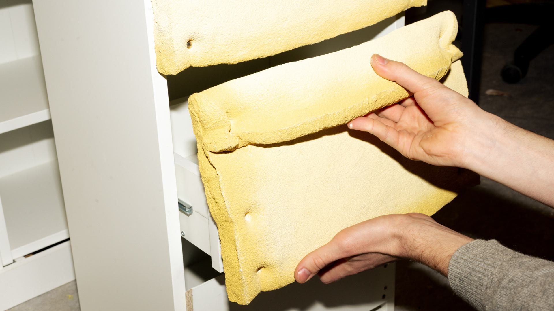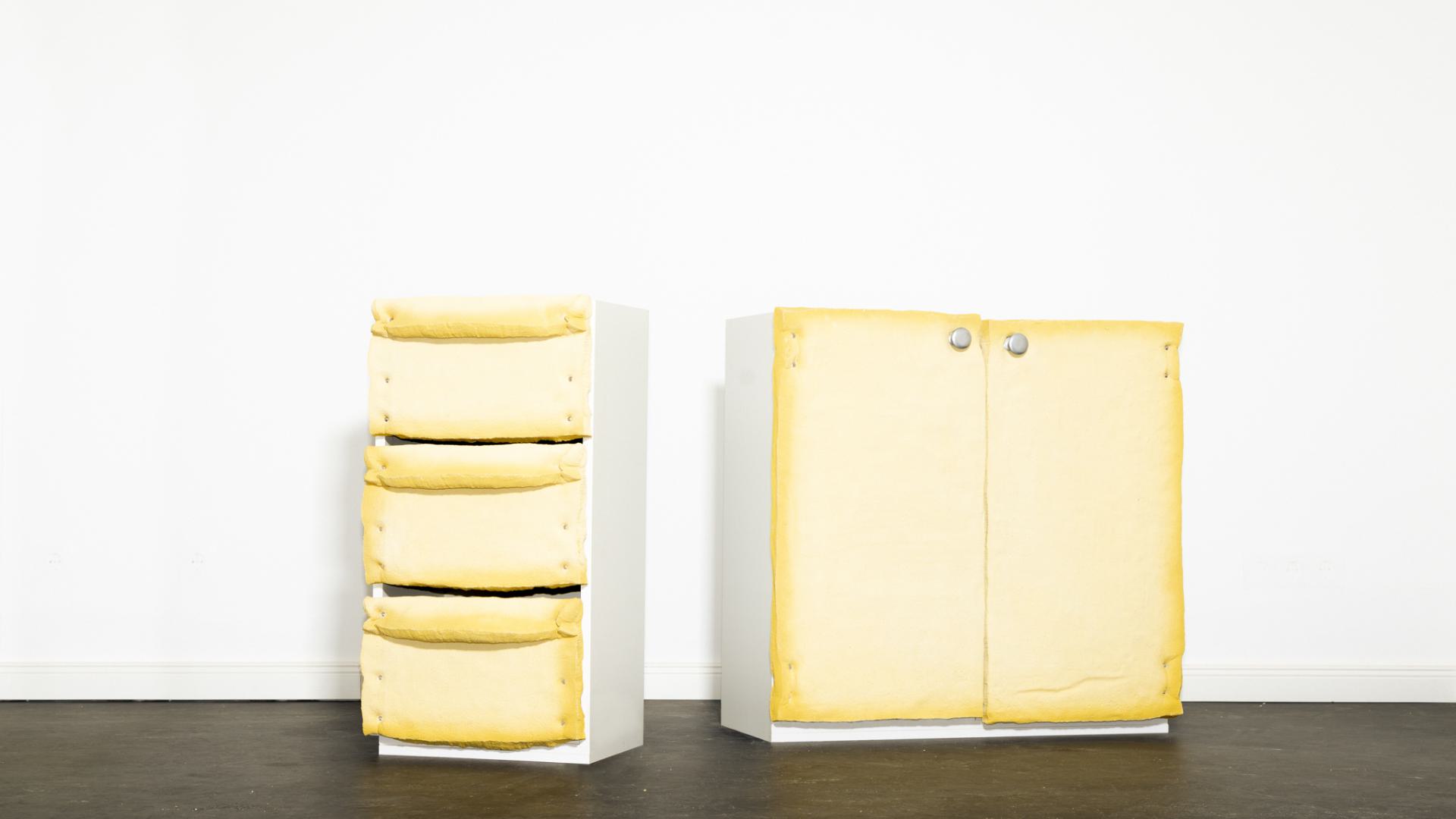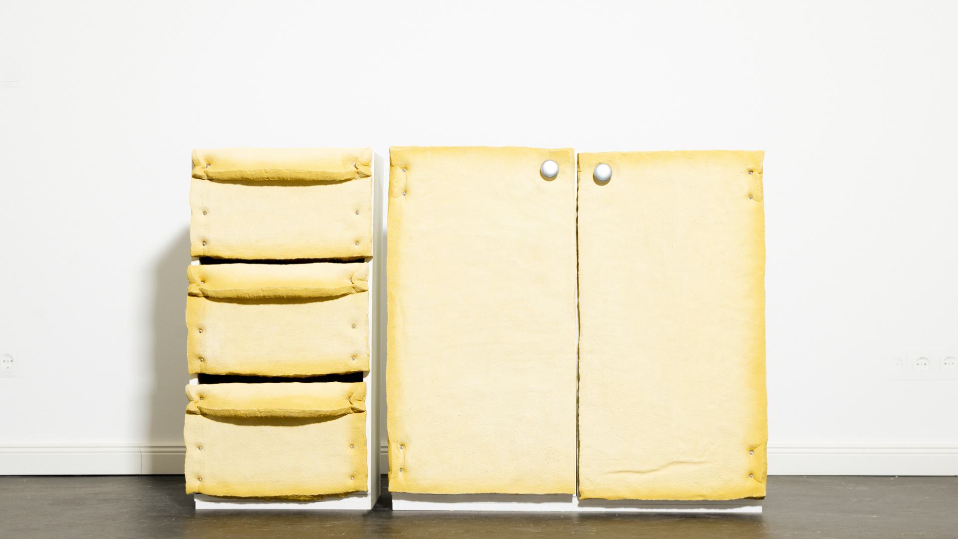 The use of “non-foam” as a furniture front allows foam to step beyond its typical, concealed context. Its absurd recontextualization as a visible surface invites the question: Why foam? and leaves the viewer considering: Why not? This moment of disruption draws attention to its non-materiality. Foam becomes a symbol of the excessive yet often invisible consumption of plastic in contemporary life. Its raw, unprocessed appearance in a functional object challenges the norms of material use and surfaces as a critique of plastic’s omnipresence. Trompe-l’œil, by creating distance between material and perception, provides a way to articulate this critique through design.