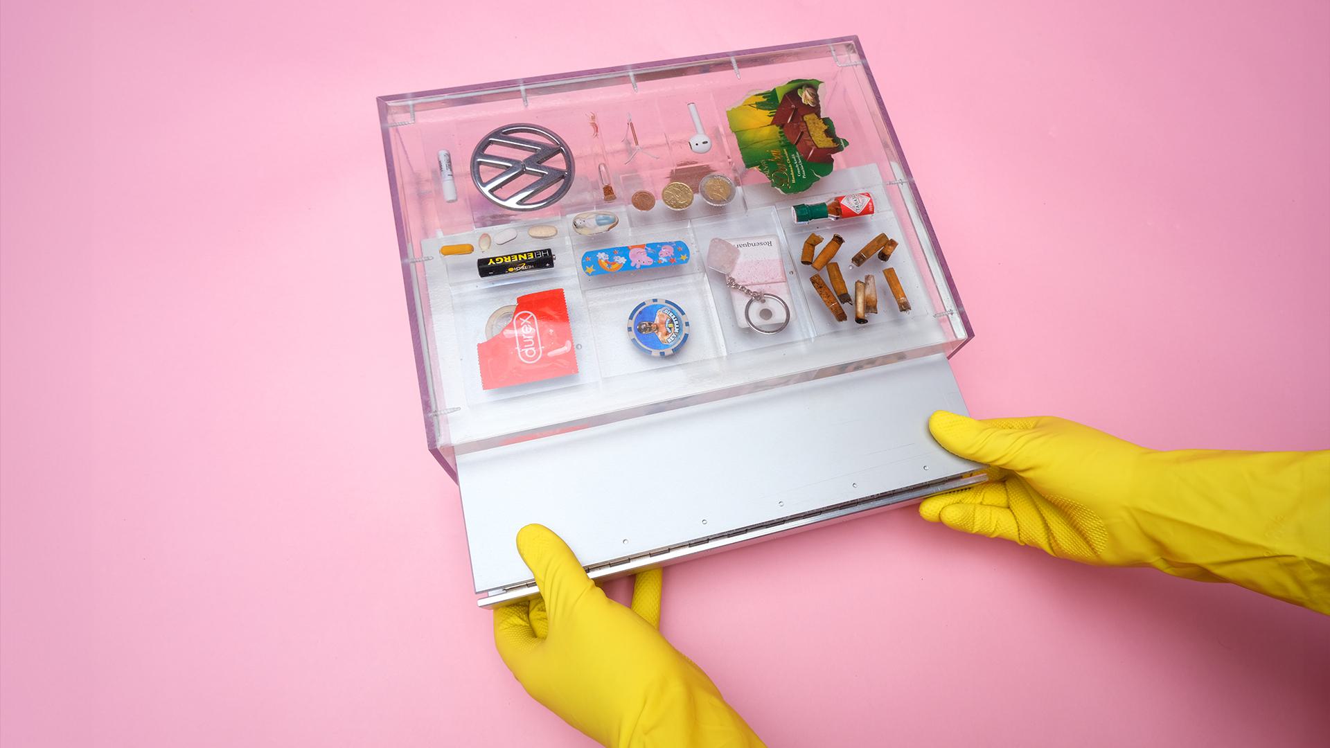 Time Capture is inspired not only thematically but also visually by the concept of a time capsule. A key element of the project are preserved objects that I collected as personal testimonies of our era. These "modern fossils" were cast in epoxy resin, photographed, and used as visual elements in the editorial, especially on the quote pages.